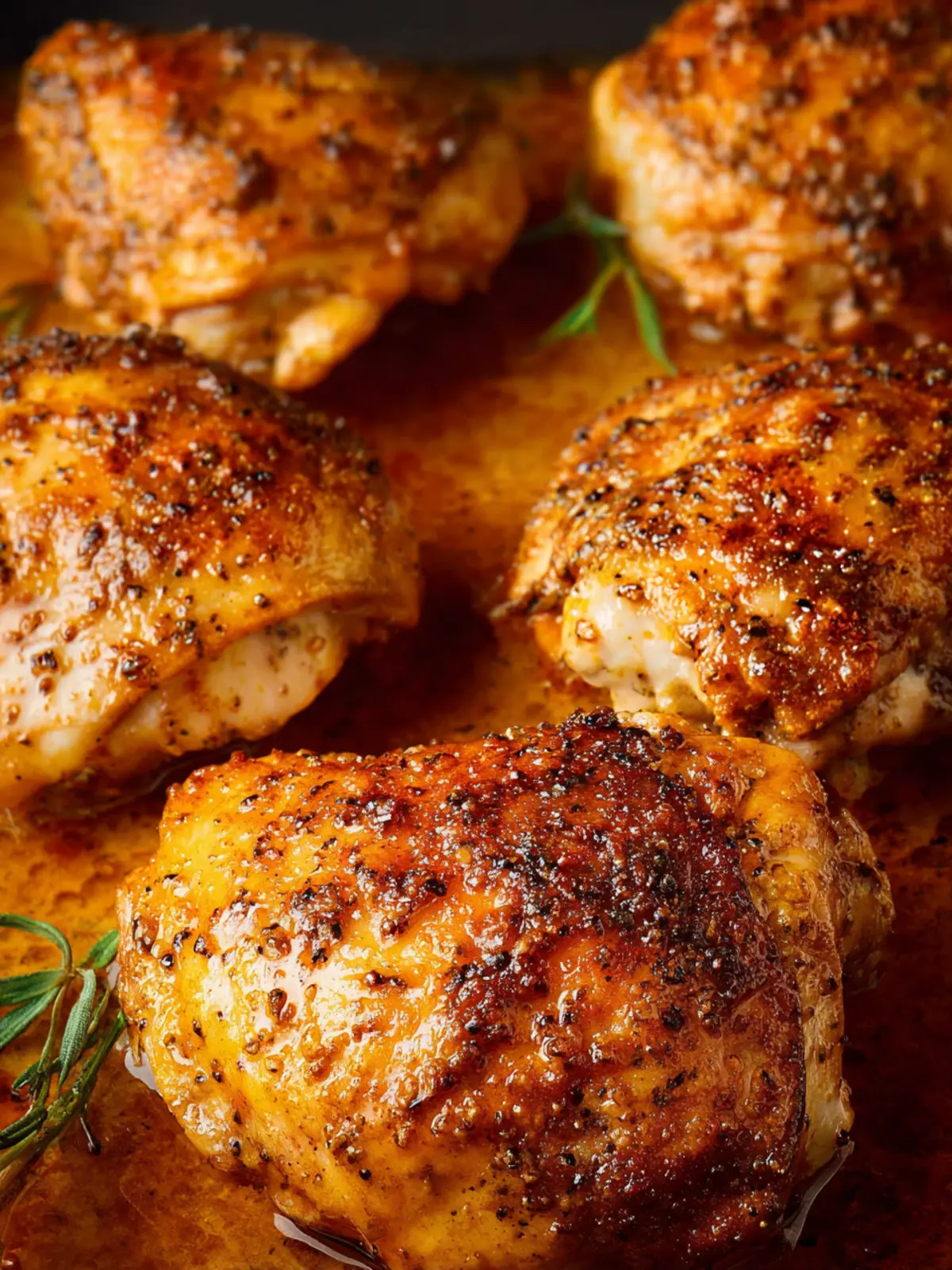 7. Midway through cooking, remove the baking dish and baste the thighs with the juices, then return the dish to the oven.