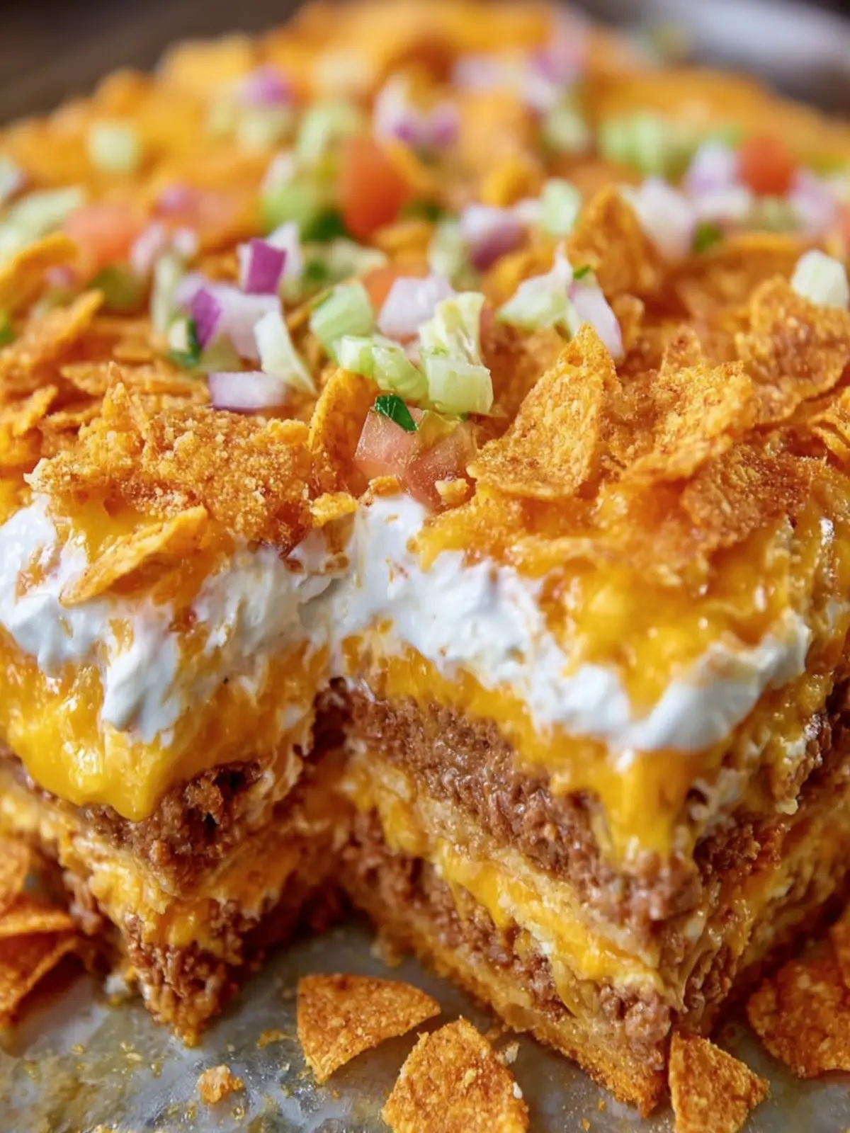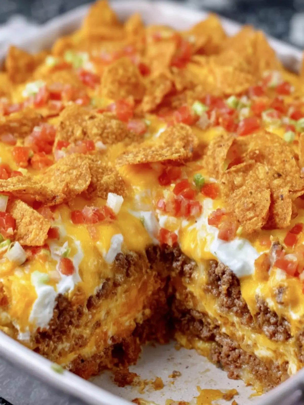 6. Repeat Layering: Add another layer of Doritos, followed by the remaining beef mixture, more cheese, and the rest of the creamy mixture. Top with any remaining cheese.