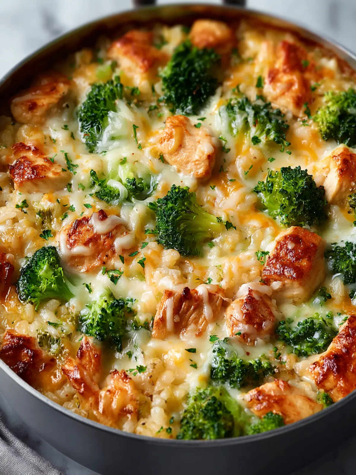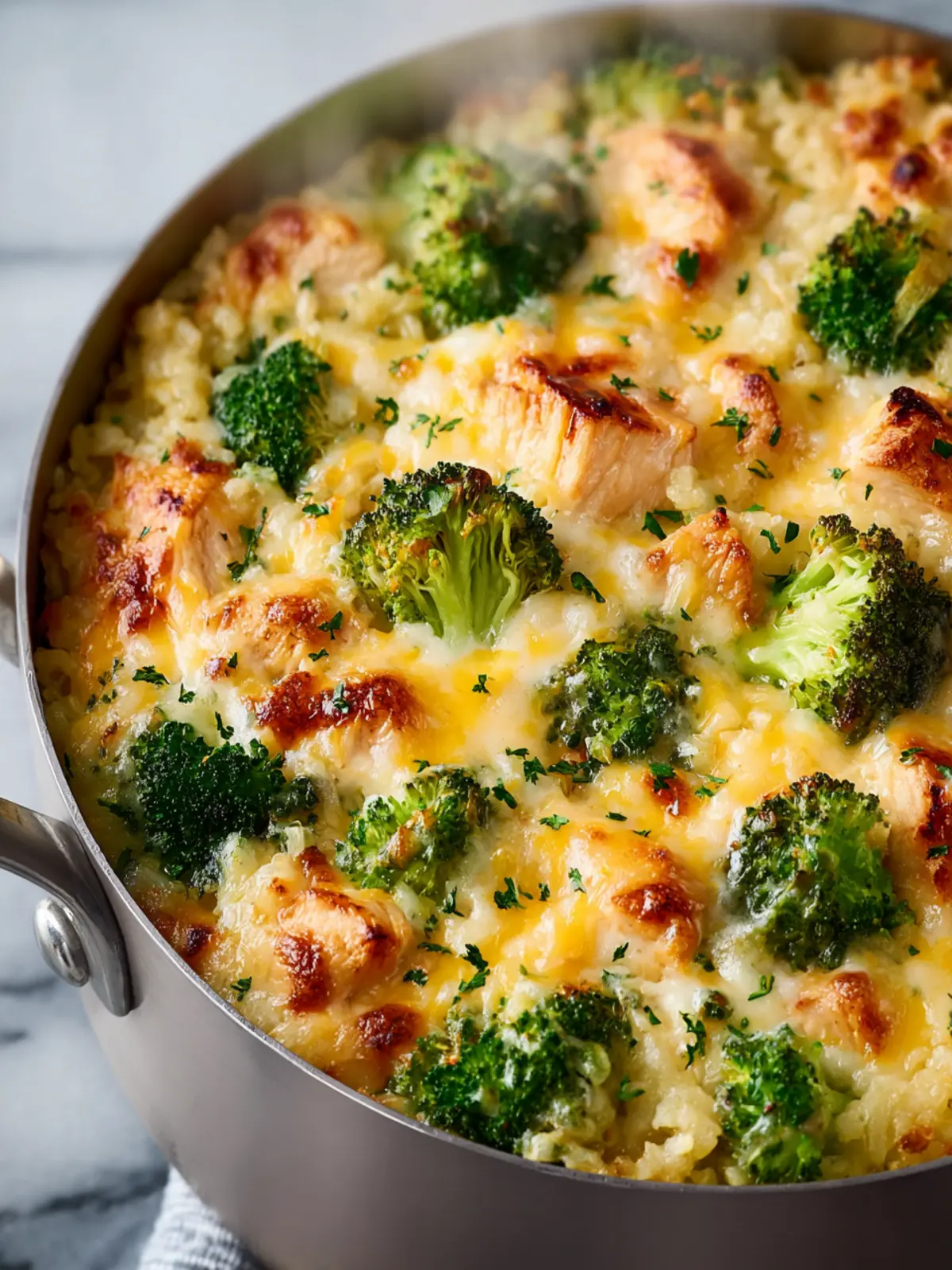 A delicious and easy one-pan recipe for cheesy chicken and broccoli rice.