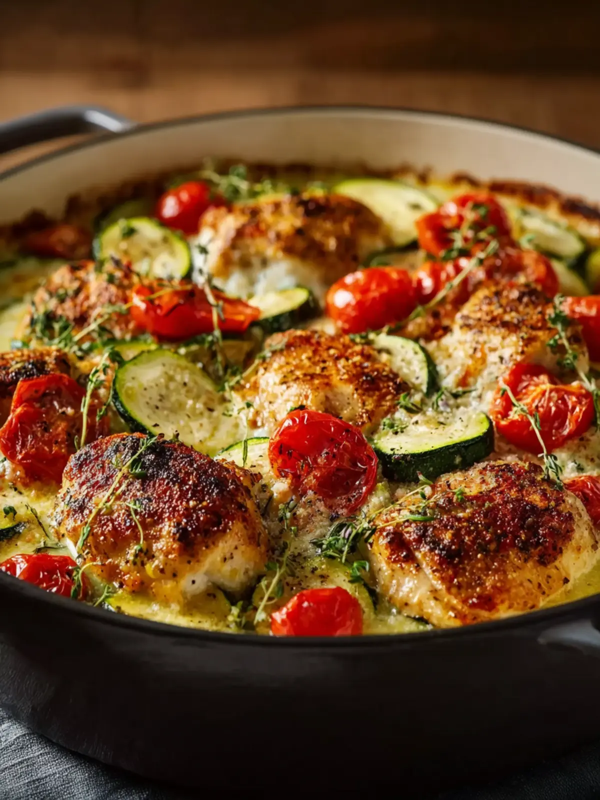 A delicious and creamy chicken zucchini bake that is perfect for a comforting dinner.