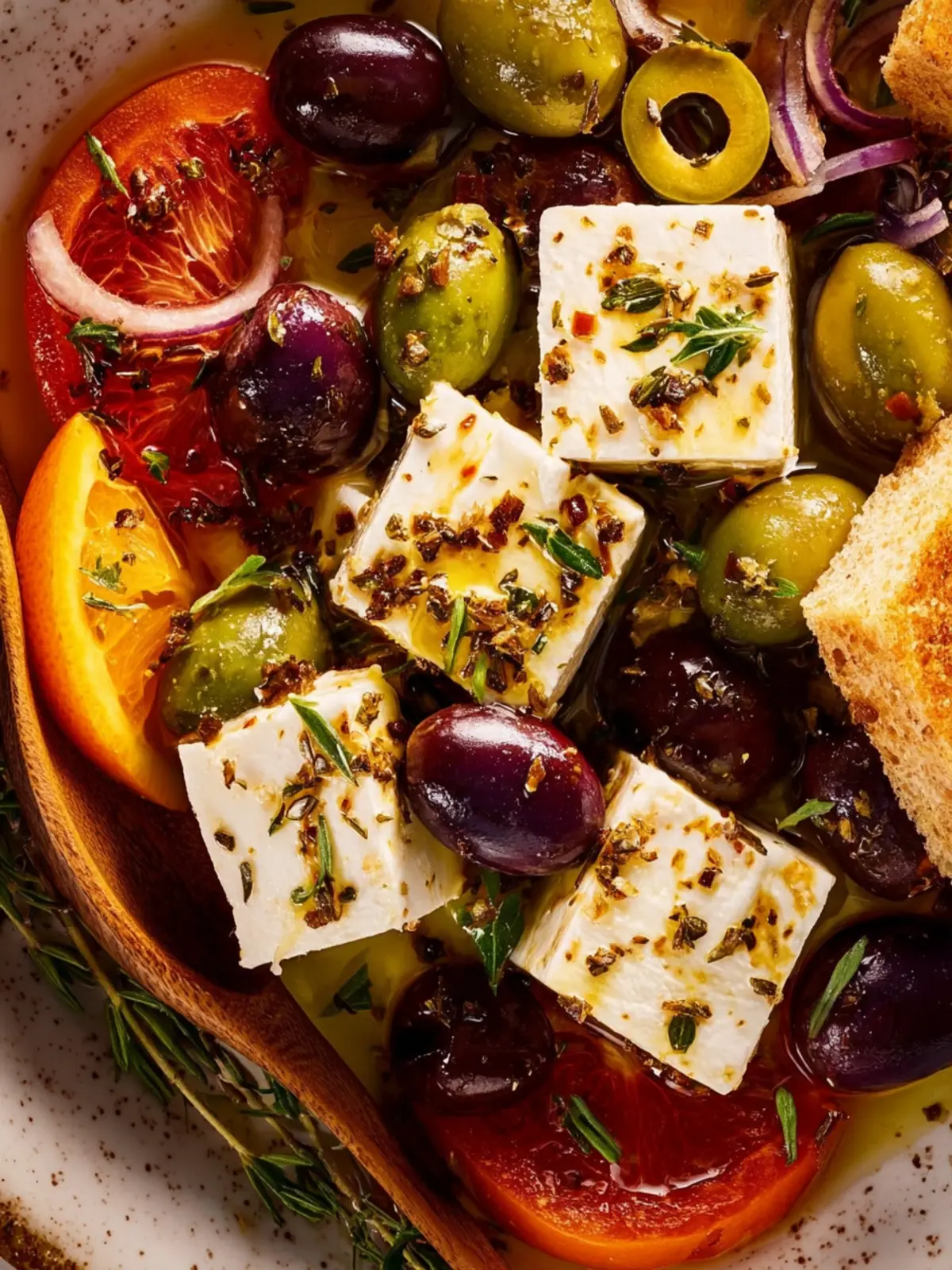 A delicious appetizer featuring marinated feta cheese and mixed olives, perfect for serving with pita, crostini, or baguette slices.