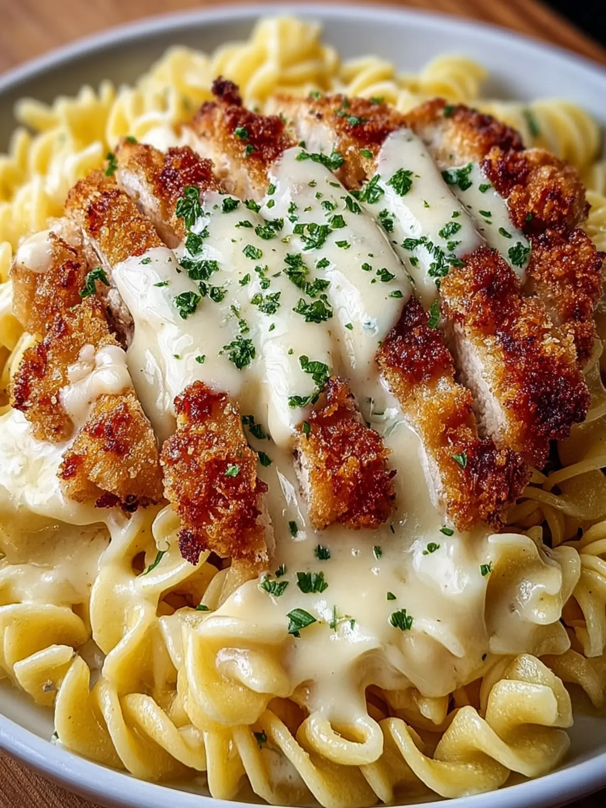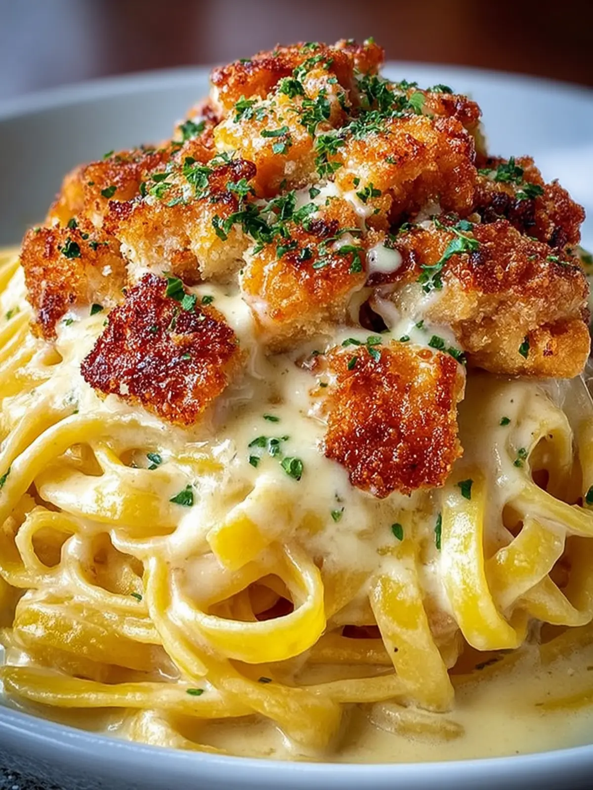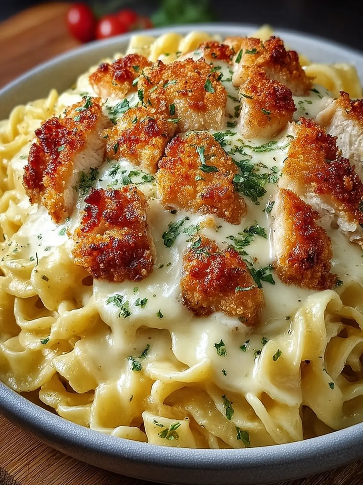 Crispy Chicken Alfredo Pasta is a delightful fusion of flavors that comes together beautifully with each carefully selected ingredient.