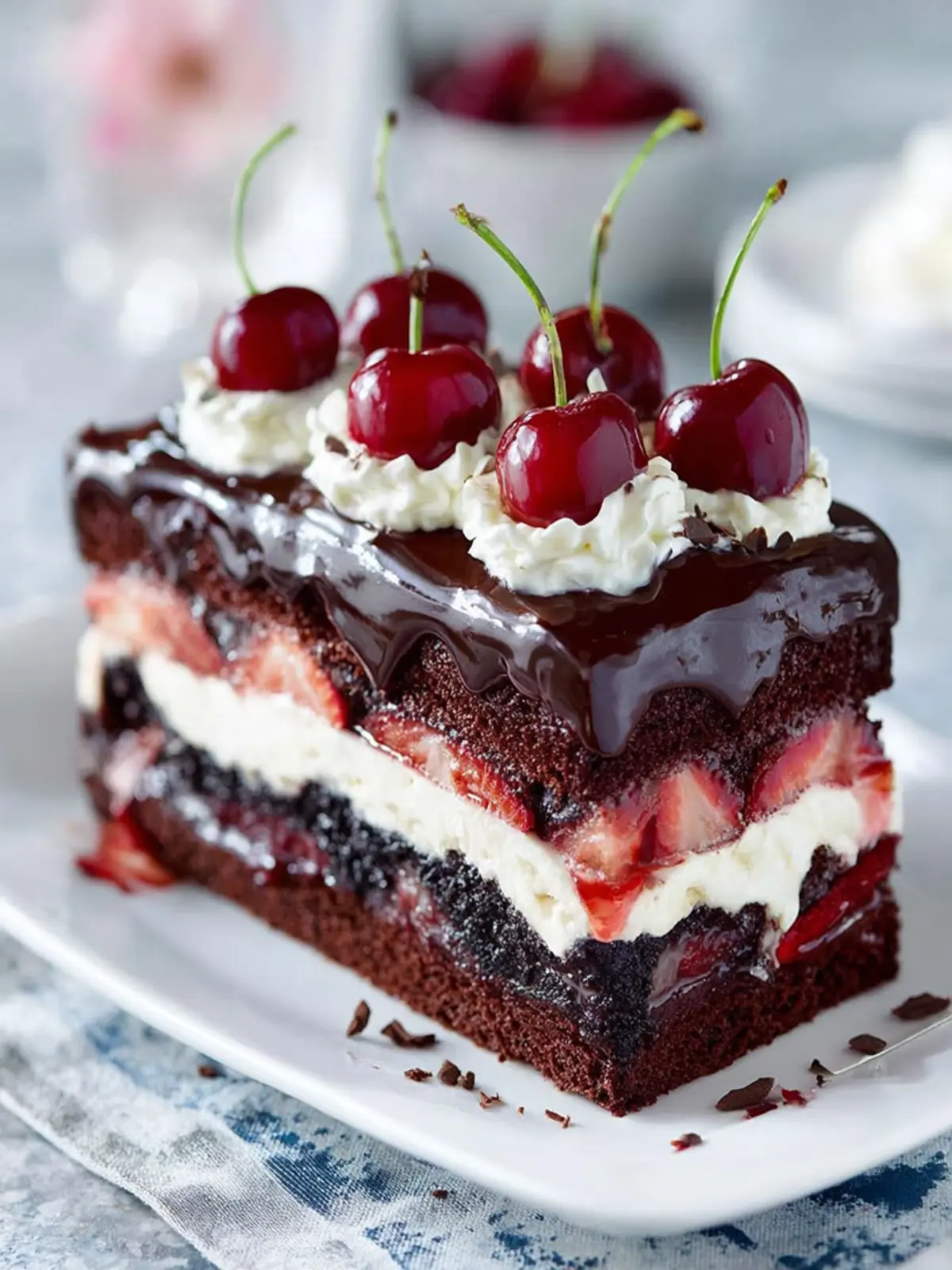 A rich and indulgent black forest cake that layers chocolate cake, cherries, and whipped cream.
