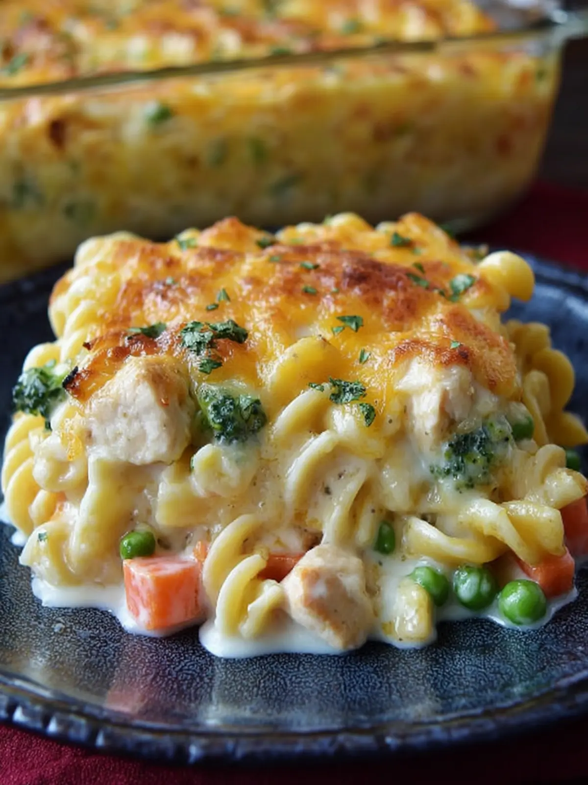 In closing, this easy chicken noodle casserole is truly a comforting dish that feels like a warm hug after a long day. Its straightforward preparation allows you to embrace spontaneity in the kitchen without the need for pre-cooked noodles, making it a go-to meal for busy weeknights. The combination of tender chicken, creamy sauce, and hearty noodles is not only satisfying but also incredibly versatile—perfect for leftovers or a family gathering. With a few simple ingredients, you can create a dish that warms the heart and pleases the palate, proving that simplicity can indeed be delicious.