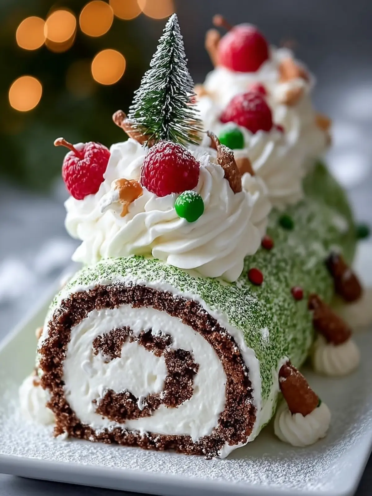 - Assemble the Yule Log: Unroll the cooled cake and spread a layer of green whipped cream over the surface. Carefully roll the cake back up without the towel. Frost the outside of the cake with more green whipped cream.