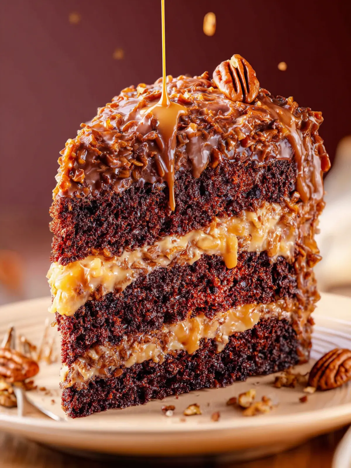 A rich and delicious German chocolate cake topped with coconut pecan frosting.