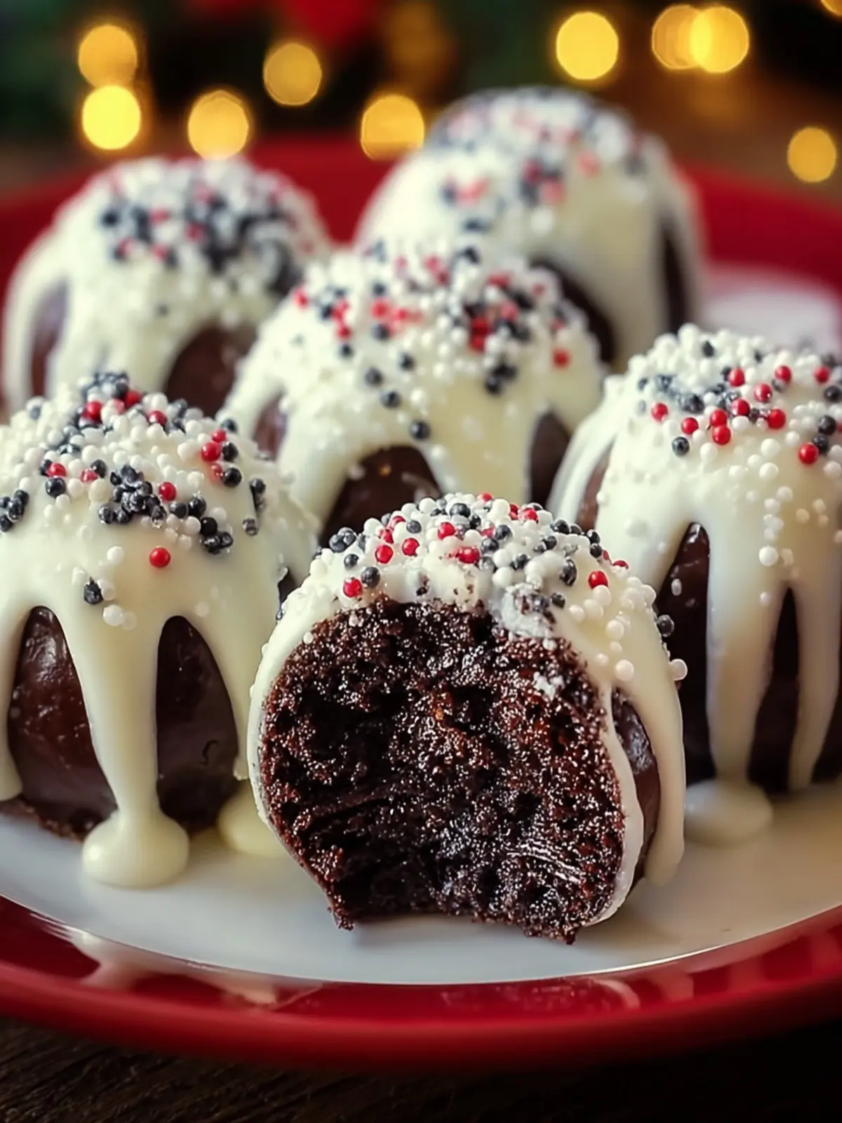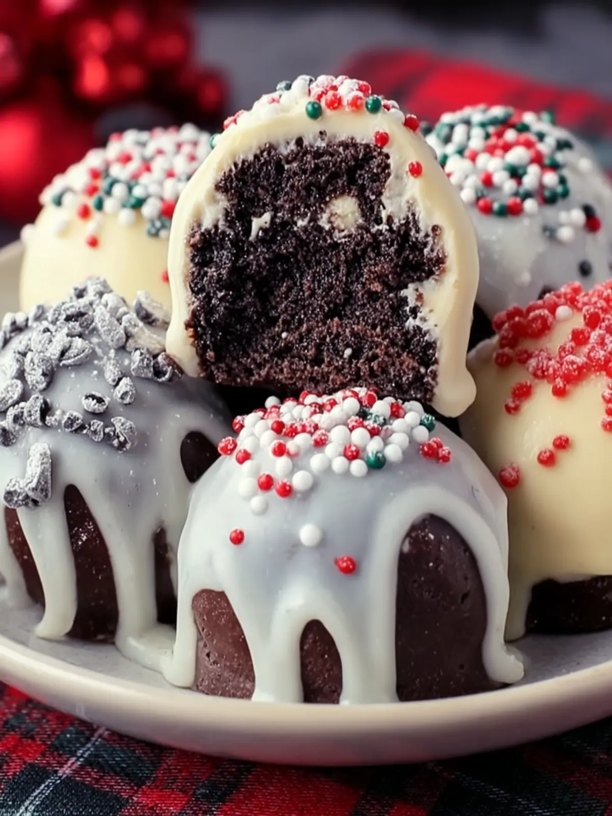 - Coat the Cake Balls: Dip each cake ball into the melted white chocolate and place back on the parchment paper. Immediately sprinkle red and green sprinkles on top before the chocolate hardens.