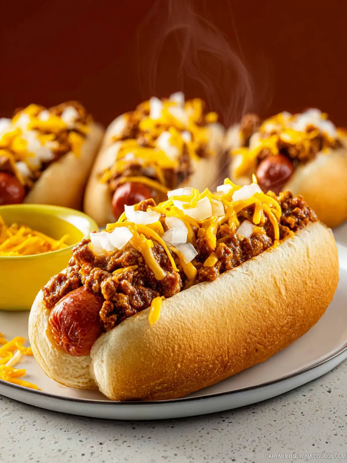 Delicious chili cheese hot dogs with ground beef and a blend of seasonings.