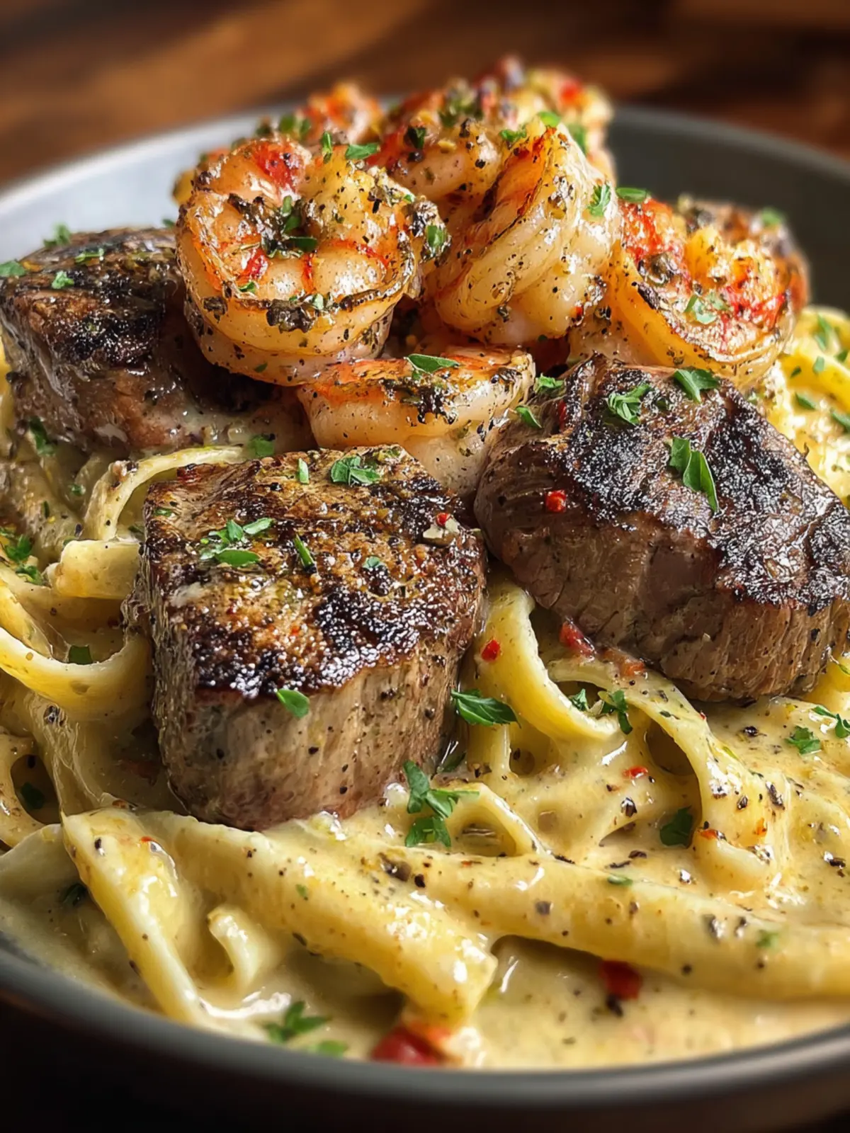 - Add cooked pasta, sliced steak, and shrimp to the sauce, mixing well before garnishing with chopped parsley.