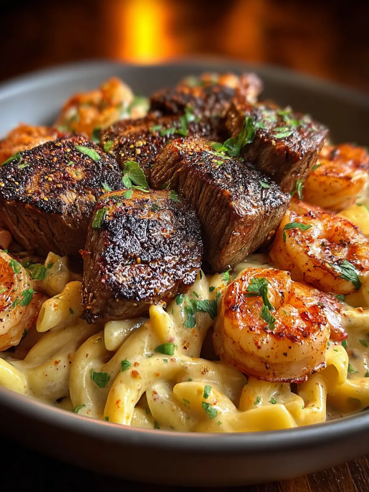This dish is best served right away to maintain the creaminess of the sauce and the tenderness of the shrimp and steak. Don’t hesitate to add a sprinkle of freshly chopped parsley or a hint of lemon zest for a burst of freshness just before serving. Enjoy your culinary adventure!