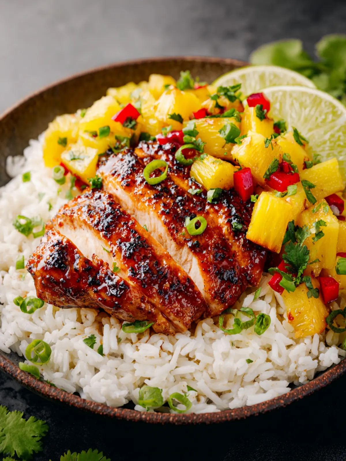 - Slice or chop the chicken. Serve over rice with pineapple salsa and diced avocado on top. Enjoy!