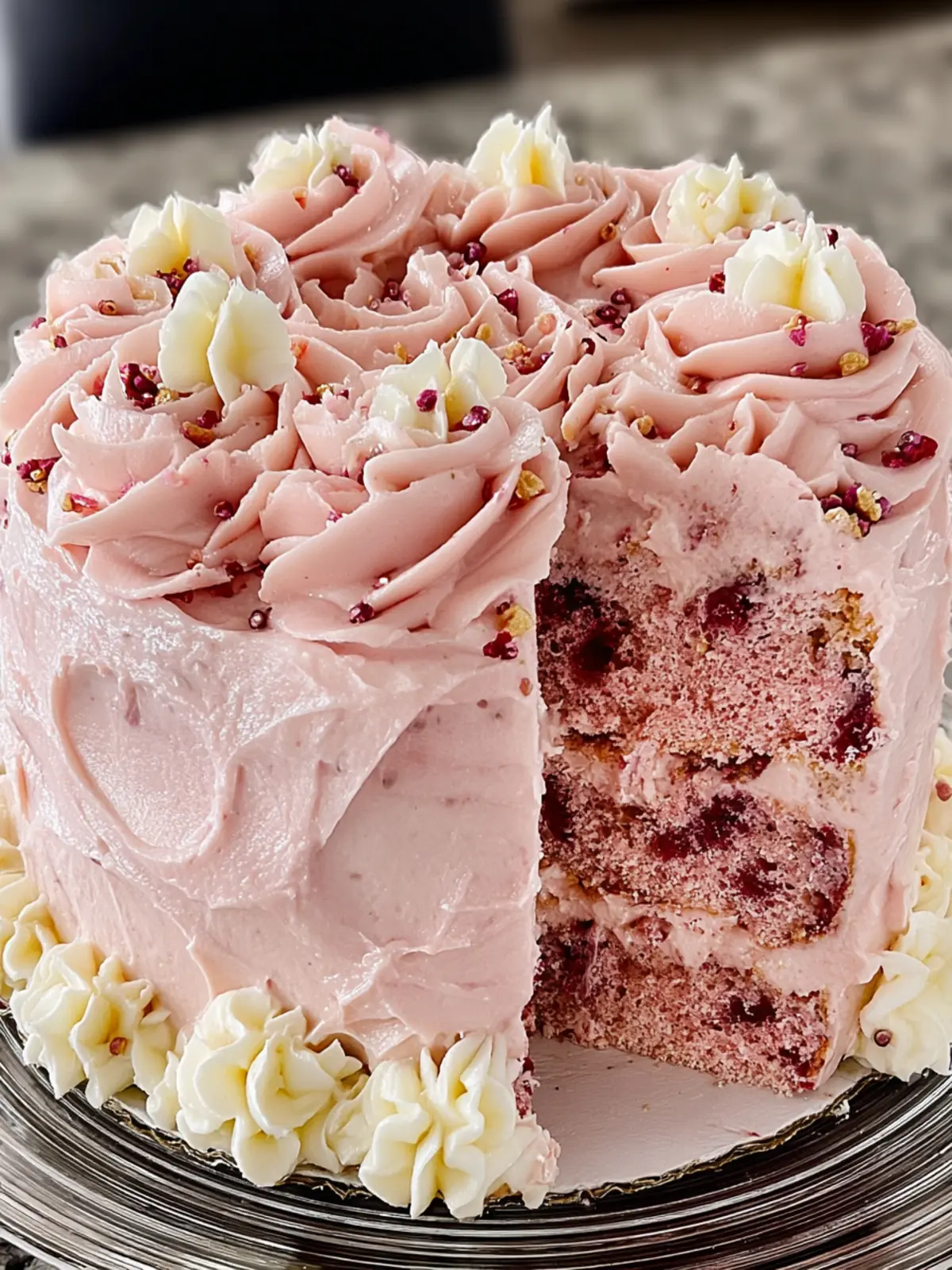 Deliciously moist raspberry cake with a pink raspberry frosting, perfect for any celebration.